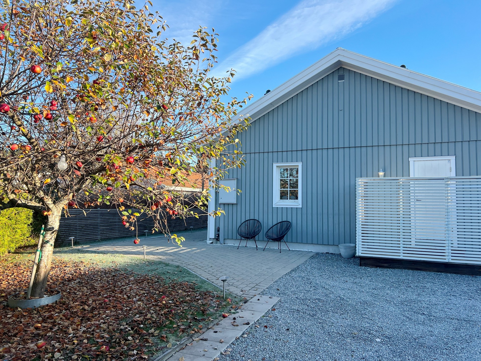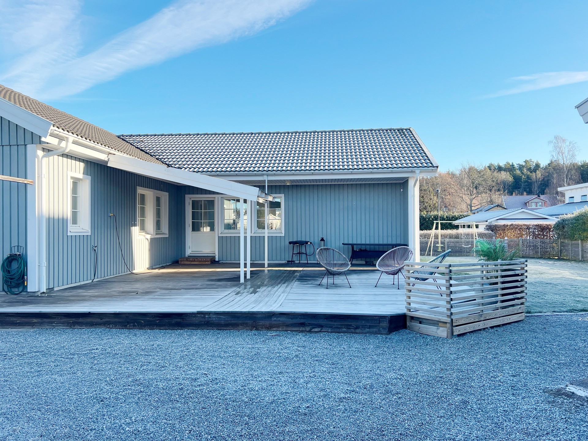 Väl tilltaget trädäck, delvis under tak, som vetter mot sydväst. Vid dörren ut till trädäcket sitter en vitmålad spaljé. Runt huset ligger en fin marksten och vid entrén finns plats för utemöbler.