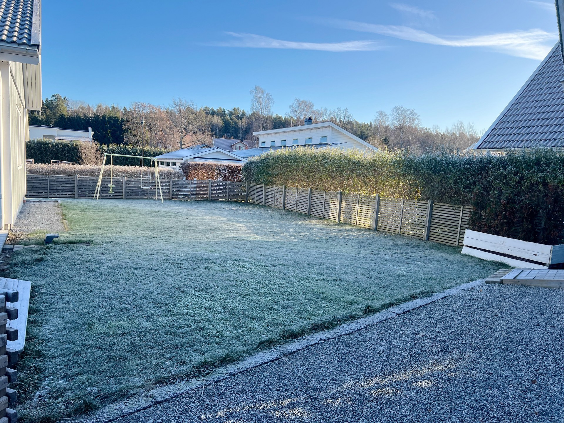 Fin, friköpt och gräsbeklädd trädgårdstomt med inslag av bl.a. äppelträd och rabarber. Tomten omgärdas av uppvuxna thujor. Vid infarten sitter en snygg infartsgrind från 2020. Runt huset ligger marksten från 2020.