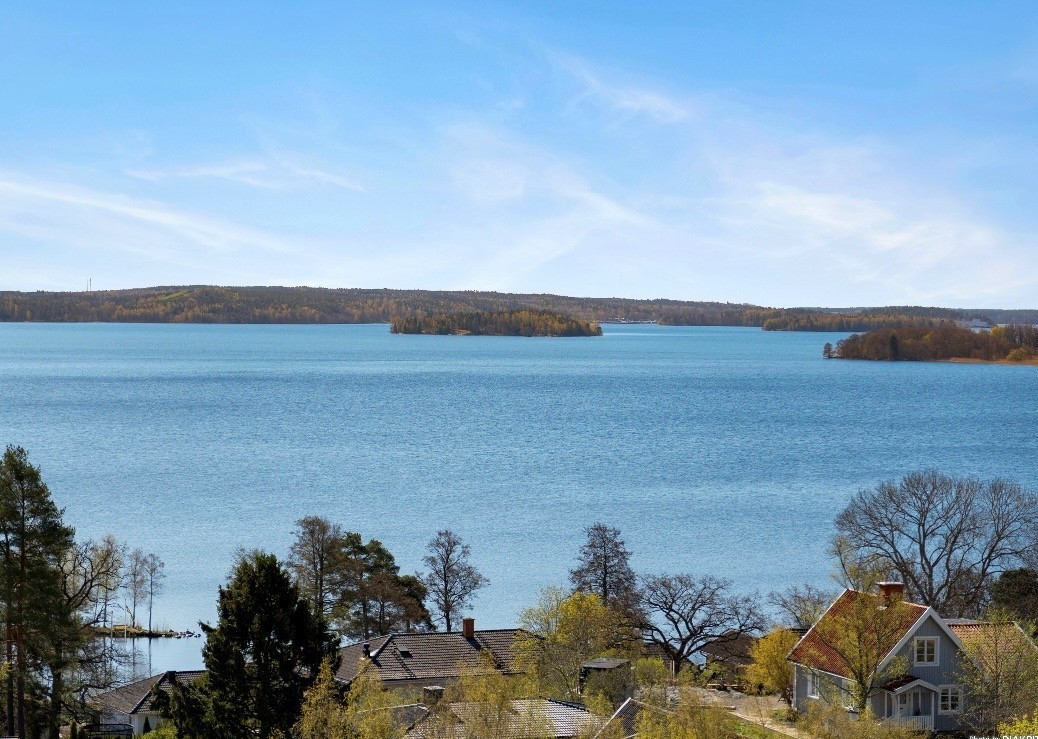 Stor inglasad balkong under tak som känns ombonad med sin träfasad. Utsikt mot söder och Mälarglimt! Utgång från vardagsrummet.